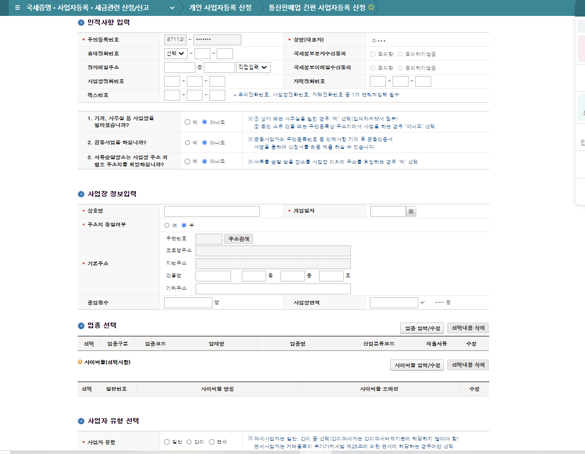 주민등록번호, 성명(대표자), 휴대전화번호 등 개인적인 인적사항을 입력해주세요.