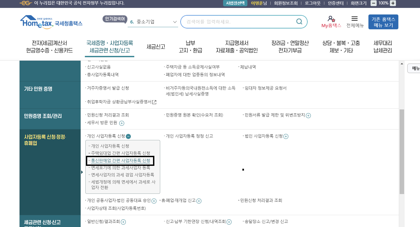 1-2. 홈택스 홈페이지 상단에서 [국세증명*사업자등록 세금관련 신청/신고] 를 클릭한 후, [개인 사업자등록 신청]을 클릭 -> [통신판매업 간편 사업자등록 신청] 을 클릭합니다.