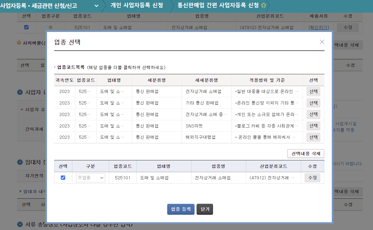 예시 항목 외에 블로그나 카페, 소셜 커머스 등 다른 사업으로 사업자등록증 신청을 진행하시는 것이면 본인 사업에 맞는 업종코드를 선택해서 진행하시면 됩니다.