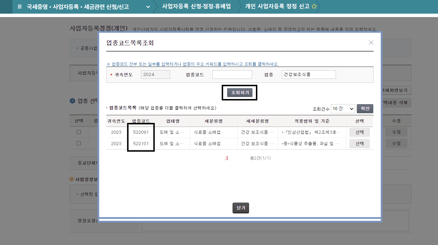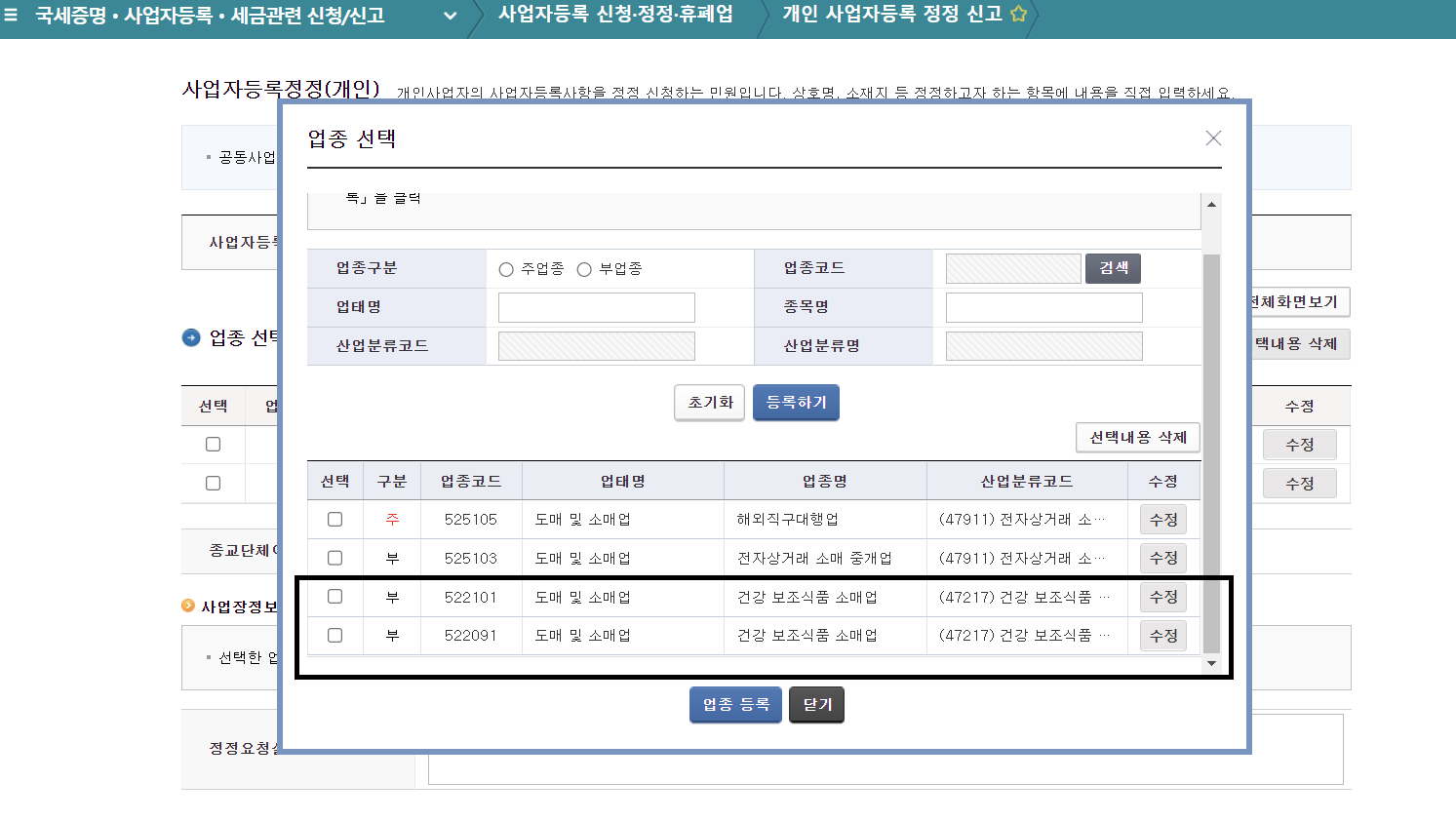 5. 업종란에 "건강보조식품" 입력 하시면 522091, 522101 두가지 업종 코드가 나오고 두가지 추가 주시면 필요한 분류는 준비가 되었다고 볼 수 있어요!