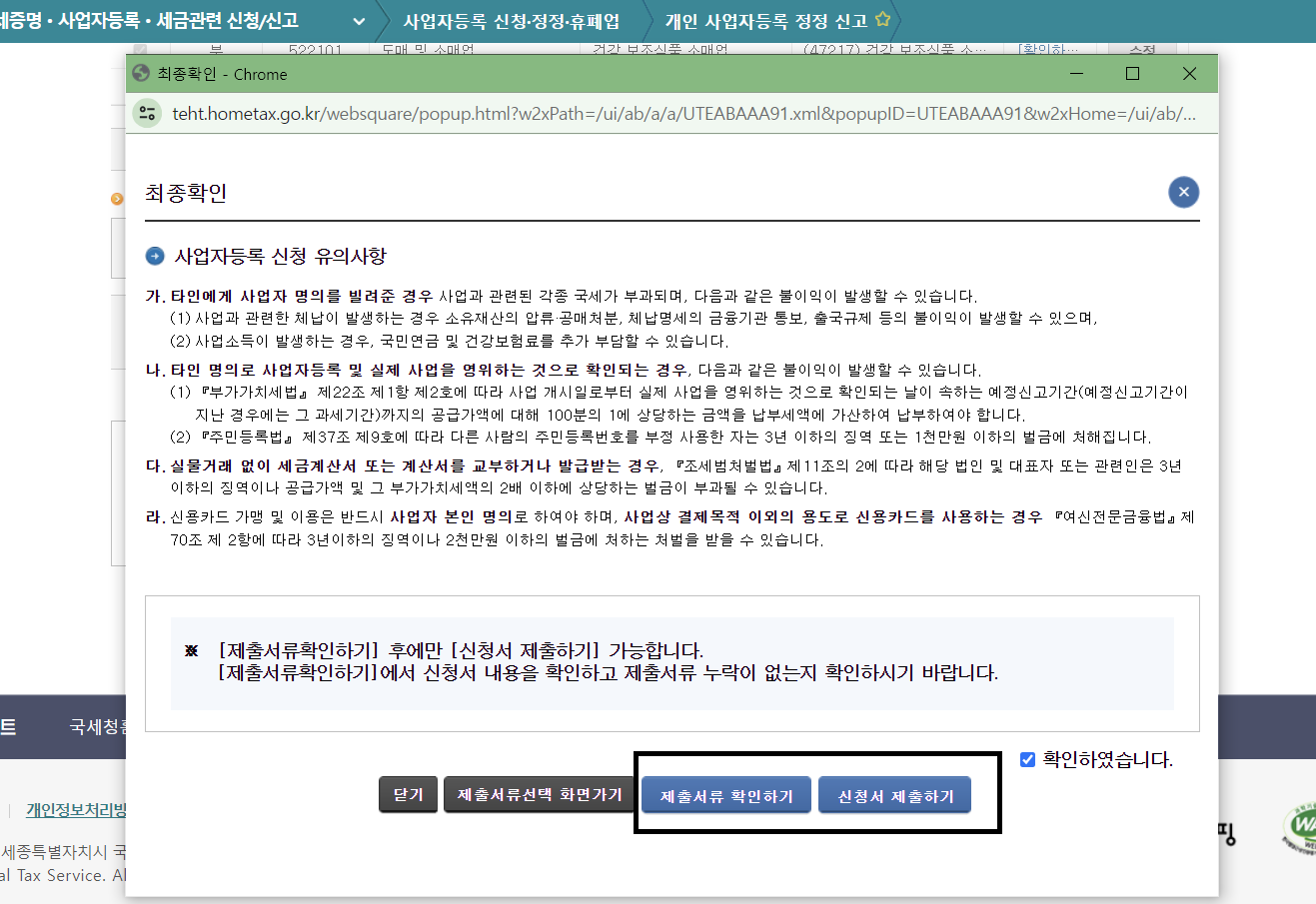 9. 마지막 최종확인 팝업창이 나온 후 [제출서류 확인하기] --> [신청서 제출하기] 로 마무리 해줍시다.