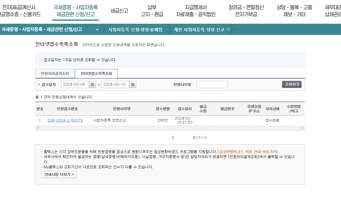 10. 위와 같이 사업자등록 정정신고가 민원으로 접수 되었으면 완료 입니다! 고생하셨습니다.
