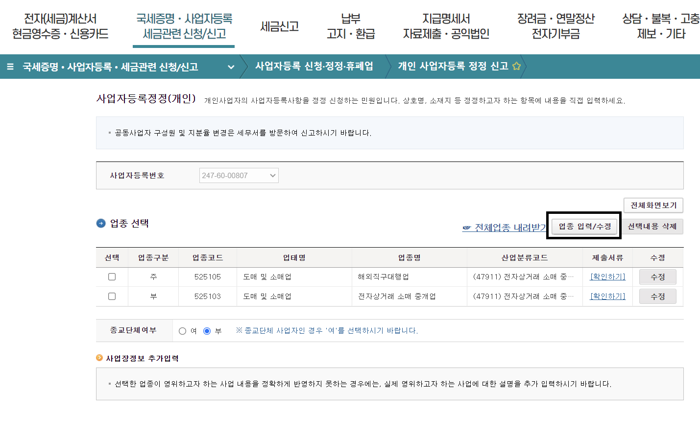 3. 사업자등록정정(개인) 화면에서 업종 입력/수정 버튼을 선택해주시고,
