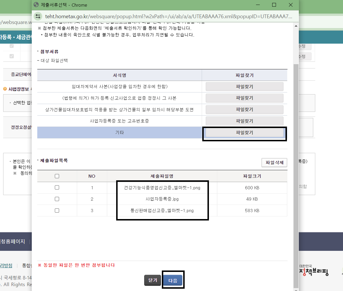 8. 제출서류선택 팝업창이 나오면 [기타] 파일찾기를 눌러 건강기능식품영업신고증, 사업자등록증, 통신판매업신고증을 첨부 후 다음을 진행 해주세요.